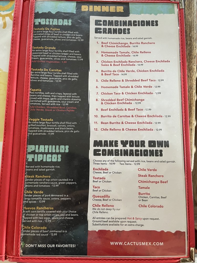 Welcome to Cactus Mexican Dining, a vibrant gem nestled in Woodbridge, California. This inviting eatery offers a delectable menu, perfect for fans of authentic Mexican cuisine. With customizable options like enchiladas, tostadas, tacos, and burritos available for just $5.99, there's something to satisfy every palate.